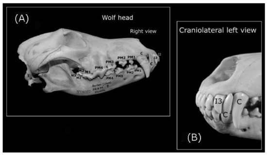 General vision of the Iberian wolf‘s teeth. C: Canine, PM2 and PM3: second and third premolar teeth, respectively; M2 and M3: second and third molar teeth, respectively. (A) Wolf skull with the right dental line indicated on the maxillary and mandibular bones; (B) Detail of the left-hand canine and I3 on the maxillary and mandibular bones.