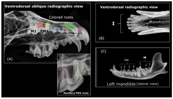 Radiographic views of the wolf‘s teeth and skull. (A) (Upper image) Right I3 root (purple), right canine root (green), PM1 root (orange), PM2 and PM3 roots (blue) and PM4 roots (white, red and yellow); (Lower image). Detail of the PM4 roots-mesiobuccal (yellow dotted line), mesiopalatal (white dotted line) and distal root (red dotted line); (B) Roots of three right maxillary incisors; (C) Molar and premolar disposition teeth in the mandible.