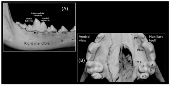 (A) Wolf‘s right mandible (lateral view) up to the PM4 tubercles and cusps; (B) The occlusive face of left maxillary M1 with its (a) mesiobuccal, (b) distobuccal and (c) distolingual tubercles and cusps.