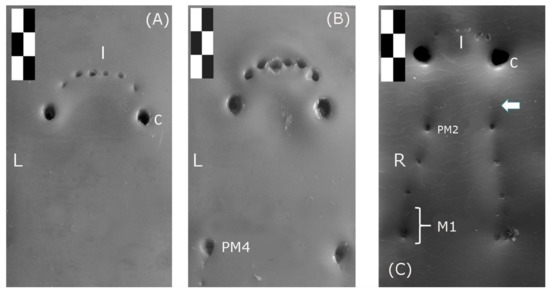The bite marks of the Iberian wolf’s mandibular premolars become progressively bigger towards the distal and maxillary PM4 (carnassial tooth), the latter the biggest of the series while the PM1 is the smallest. The maxillary bite mark is a little larger than the mandibular one, which explains the deeper bite. Premolar teeth have a straighter disposition in both the maxillary (not visualized) and mandibular arch (Figure 4A).