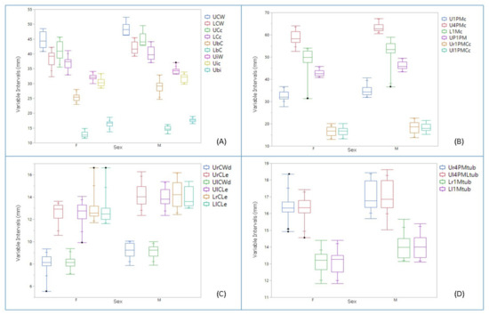 Intervals of the dental measurements considering sex as a source of variation. The minimum, maximum, mean, and quartiles values for each variable according to sex. The black points are the outlier values. (A) Measurements taken between right and left canine and between right and left incisors on maxillary and mandibular bones; (B) Measurements taken between right and left premolars and between molars; (C) Measurements taken on canines, (D). Measurements taken on premolars and molars teeth.
