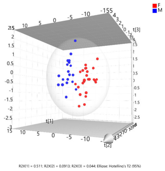 The 3D scatter PLS-DA plot showing the sex differentiation. The 3D scatter PLS-DA plot of the scores showing the distribution and relationship of the variables within and between sexes. The initial latent variables t(1), t(2) and t(3), explained 51.1, 9.13 and 4.4% of the variability, respectively. The whole model explained 64.6 % of the variance.