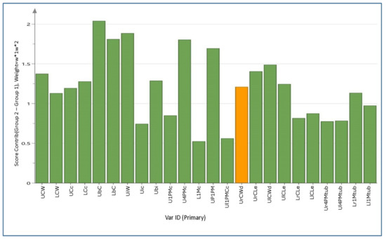 The contribution plot visualizes the variables and their contribution (weight) to the differentiation between sexes (Figure 8). The analysis showed that the most important variable for this differentiation was UrCWd (orange column), which presented the strongest variation between sexes. Sequentially, the next most important variables were UrCWd, UbC, UiW, LbC, U4PMc, UP1PM, and Ubi.