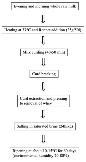 Daily, the milk of the trial was collected, separately (CTR and OC groups), into the tanks of the farm and used for the production of artisanal cheese, called “Canestrato”, by using a traditional practice (Figure 1). The rennet was added to the milk and the clotting occurs as a combined effect of the rennet and the natural microflora of the milk which acts as starter cultures. Cheeses were seasoned for 60 days in a ripening room of the factory, at the temperature of 10–15 °C and at the humidity of 70%–80%. Ten ripened cheese wheels, for each group, produced by using the milking of September were collected, vacuum packaged and stored under refrigerated conditions (4 ± 2 °C); for each ripened cheese, three portions were sampled and subjected to the physical-chemical analysis, for a total of 60 samples analyzed (10 cheese wheels × 2 groups × 3 samplings).