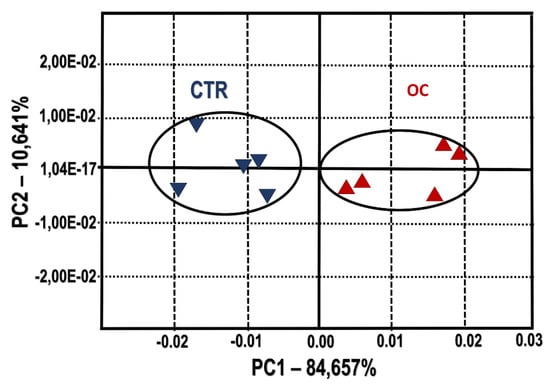 Principal Components Analysis (PCA) plot of cheese samples. CTR group: five cheese wheels after 60 days of ripening obtained from the milk of dairy cows fed concentrate without olive cake supplements. OC group: five cheese wheels after 60 days of ripening obtained from the milk of dairy cows fed concentrate with olive cake supplements. Discrimination index = 59. The two principal components (PC1 and PC2) are responsible for 95.3% of the variation showed by sensor’s signals used as loadings.