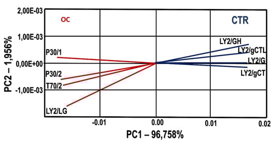Principal Components Analysis (PCA) with the loading of selected sensors for the cheese samples. CTR group: five cheese wheels after 60 days of ripening obtained from the milk of dairy cows fed concentrate without olive cake supplements. OC group: five cheese wheels after 60 days of ripening obtained from the milk of dairy cows fed concentrate with olive cake supplements. LY2/GH, LY2/gCTL, LY2/gCT, LY2/G are the selected sensors involved for CTR group and LY2/LG, P30/1, T70/2, P30/2 are the selected sensors involved for OC group. Discrimination index = 74. The two principal components (PC1 and PC2) are responsible for 98.71% of the variation showed by sensor’s signals used as loadings. The loading length of a trait measures the magnitude of its effect (positive or negative).