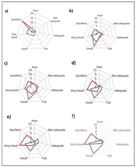 Consumer evaluation of cheeses from two groups CTR cheese (blue) and OC cheese (red) for: (a) appearance; (b) color; (c) texture; (d) smell; (e) taste; (f) overall acceptance. CTR group: five cheese wheels after 60 days of ripening obtained from the milk of dairy cows fed concentrate without olive cake supplements. OC group: five cheese wheels after 60 days of ripening obtained from the milk of dairy cows fed concentrate with olive cake supplements.