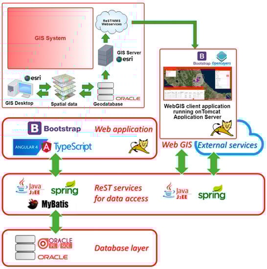 The rest service layer was created using the J2EE, Spring, and MyBatis technologies to connect with the database and the application user interface. This layer provides a set of services related to all the functionalities of the system and also enables the total decoupling between the data and application interfaces. Thanks to these services, it is possible to develop, at the front-end level, a web application rather than other external desktop or mobile applications. This layer also ensures communication and interfacing with the Geographic Information Systems (GIS) system.
