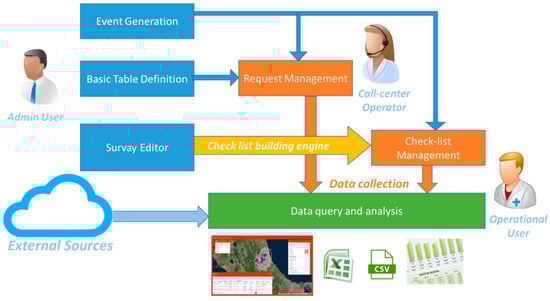The new information system was developed according to a multilevel (or multi-layer) architecture, as shown in Figure 1. This architecture allows greater flexibility and independence in the software implementation and the possibility of decoupling various components of the application itself. In particular, four components were implemented and integrated: the database layer, the ReST service layer, the web application, and the web GIS. Figure 2 shows an overall system framework and the principal SIVENE features organized in a software workflow chart in order to highlight the emergency management through the provided tools: definition of new emergency events; decoding and work tables; management of requests for assistance; survey editor and dynamic check-lists; check-list management and data collection; data query and analysis.