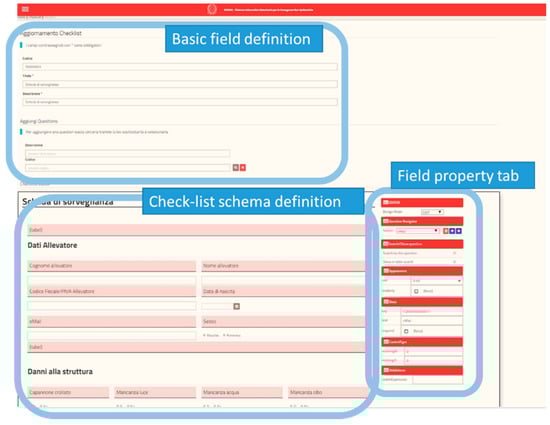 Figure 3. Survey editor to dynamically build checklists. The admin user, using this feature, can build a new checklist. The figure shows the different sections of the tool: a section for a basic element definition; a section to define the schema of a new checklist where, using drag-and-drop, it is possible to combine several basic elements; and a property tab to define the basic characteristics of each field (such as type, position, dimension, etc.). - Checklist management and data collection: the system presents to the operational users different checklists, based on this dynamic definition, as different forms (Figure 4) for data collection. These forms can be printed and the data collected on paper or filled (directly from the field or after data collection on paper) using a web application from a PC or mobile devices (tablet or smartphone).