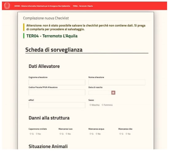 Figure 4. Web form example of the dynamic checklists used for the entry of damage data collected for the planning of intervention measures (i.e., farmer’s personal information, type of structural damages, and number of dead or injured animals). - Data query and analysis: data stored and managed by SIVENE are related to the information concerning requests for assistance or collected during in-field inspections by using dedicated check-lists. The data could include the magnitude and the geographical coordinates of the epicenter of the earthquake (data source: National Civil Protection system); the address and geographical coordinates; and the type of livestock holdings and farms (i.e., slaughterhouses, staging points, animal markets, breeding, and assembly centers), the type of animal production (i.e., meat, eggs, milk, and wool), the number of animals, and the species held in the farms (data source: National Data Bank) affected by the disaster. SIVENE users can extract all the data collected in different formats as raw data in csv, tab delimited, xls, etc. or as preconstructed data tables, graphs, maps, etc. for further analysis.