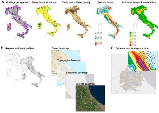 (A) Geodatabase datasets: holdings per species, livestock farms, animal density per species, the seismic hazard, and the estimated seismic livestock vulnerability. (B) Additional layers displayed in the web GIS: administrative boundaries (regions and municipalities) and base maps, including street, topographic, simplified, and satellite. (C) The simulated seismic zone.