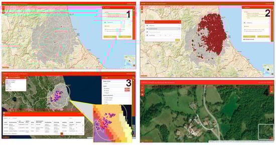 Figure 6. Web GIS application workflow: (1) Identification of municipalities involved in the emergency area. The map shows the earthquake epicenters (red dots) and the administrative units involved (selected by user through the “search” toolbox, in the upper right, listing all emergency events stored in the system) in the emergency area of interest. (2) The “exposed elements” (livestock farms) falling in the emergency area can be identified and showed on the map as dots of different colors using the “data filter” tab based on a predetermined list of different types of structures, animal species, and type of productions (meat, eggs, milk, and wool). (3) The “data filter” tab allows the user to refine the search for holdings selected according to specific criteria (e.g., number of animals> 100), and a set of related data is shown on the map. The legend (per the holding layer) at the top left helps reading the map; the dots are colored according to the species; and the “table” tab at the bottom right, showing the information related to each farm (i.e., address, owner, species, number of animals, production type, etc.), is exportable as an excel file. The farms insisting on a specific risk level can be easily displayed by selecting the seismic hazard layer on the tab panel at the top right. (4) A zoomed farm (fuchsia dot) on the satellite map also allows the user to easily visualize details of the farm position and accessibility.