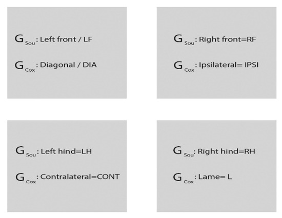 The GSou and GCox dog limbs nomenclature scheme. GSou (group sound); GCox (group coxarthrosis); LF (left front limb); RF (right front limb); LH (left hind limb); RH (right hind limb); DIA (diagonal limb); IPSI (ipsilateral limb); CONT (contralateral limb); L (lame limb).