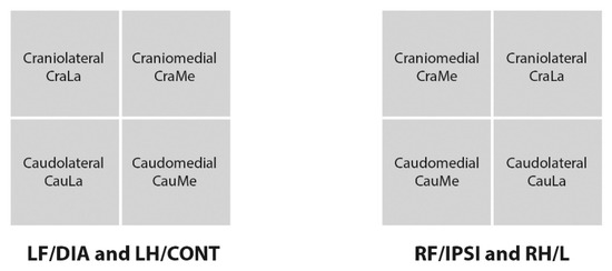 The data were processed by SPSS software, version 24. A normal distribution was confirmed by the Kolmogorov–Smirnov test. A mixed model was used to analyze the limbs (LH/CONT versus RH/L, LF/DIA versus RF/IPSI), direction (front versus hind), and quadrants (cranial versus caudal, lateral versus medial). A general linear model (ANOVA) was used to calculate the differences between groups. In each paw, the cranial-lateral or medial-quadrants were compared with the caudal-lateral or medial-, respectively, and lateral-cranial or caudal-quadrants with the medial-cranial or caudal-, respectively. Each quadrant was compared with its correspondent in the contralateral limb (front or hind limb) within the group. Between groups, each quadrant was compared with its corresponding paw from the other group [13]. Multiple comparisons were performed by applying Sidak’s alpha correction procedure. The data are presented as mean ± standard deviation (SD) and the level of significance was set at p < 0.05.