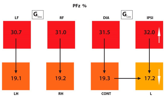 Scheme representing the PFz% of the limbs from GSou and GCox. The black arrows represent a significant difference between the limbs within groups (for example, in GCox, there was a difference between CONT and L limbs), and the white arrows, between the groups (for example, there was a difference between GSou and GCox in RF/IPSI and RH/L limbs). The color scale within each group: higher values are represented in darker colors and lower values in lighter colors. PFz% (peak of vertical force normalized as percentual of total force); GSou (group sound); GCox (group coxarthrosis); LF (left front limb); RF (right front limb); LH (left hind limb); RH (right hind limb); DIA (diagonal limb); IPSI (ipsilateral limb); CONT (contralateral limb); L (lame limb).
