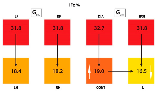 Scheme representing the IFz% of the limbs from GSou and GCox. The black arrows represent a significant difference between limbs within groups (for example, in GCox, there was a difference between CONT and L limbs), and the white arrows, between groups (for example, there was a difference between GSou and GCox in LH/CONT and RH/L limbs). The color scale within each group: higher values are represented in darker colors and lower values in lighter colors. IFz% (vertical impulse normalized as percentual of total force); GSou (group sound); GCox (group coxarthrosis); LF (left front limb); RF (right front limb); LH (left hind limb); RH (right hind limb); DIA (diagonal limb); IPSI (ipsilateral limb); CONT (contralateral limb); L (lame limb).