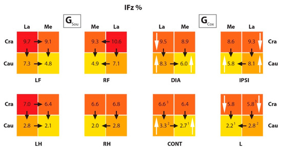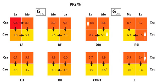 If we compare the lateral quadrants with the respective medial quadrants, in both groups, for PFz% the CraLa quadrants did not differ in principle from the CraMe results, except in the diagonal extremity (i.e., LF) of healthy dogs. In contrast, the IFz% in GSou showed ever higher values of the CraLa than in the CraMe quadrants, except for the CraLa versus CraMe of the RH.