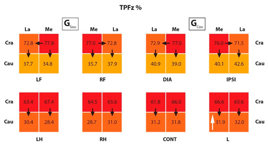 The p values for PFz%, IFz%, and TPFz%, comparing the quadrants CraLa, CraMe, CauLa, and CauMe of the IPSI (RF), DIA (LF), CONT (LH), L (RH) limbs within GSou and GCox.