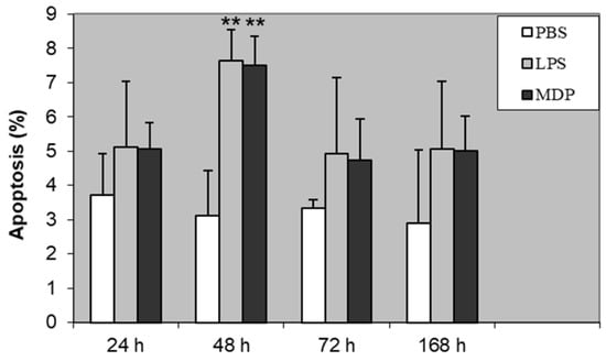 The proportion of apoptotic lymphocytes following induction of bovine mammary glands with PBS (control), LPS, and MDP. Statistically significant differences between control (PBS) and LPS or MDP is marked with asterisks (** P < 0.01).