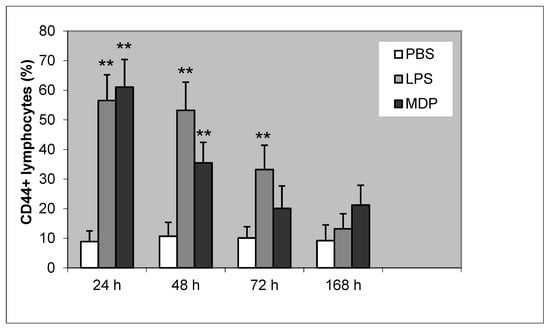 Proportion of CD44+ lymphocytes following induction of bovine mammary gland with PBS (control), LPS, and MDP. Statistically significant differences between the control (PBS) and LPS or MDP is marked with asterisks (** P < 0.01).