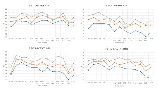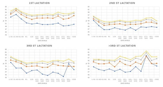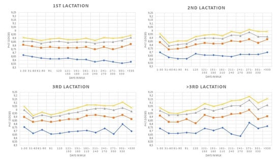 These patterns were only partially confirmed by analysis of P + LT values (Figure 2). Indeed, trend analysis showed a significant positive trend for most of the curves. The few exceptions are represented by cows with more than one parturition with ≤50,000 cells/mL, where the trend observed was not significant, whereas a significant negative trend was observed for primiparous cows ≤50,000 cells/mL.