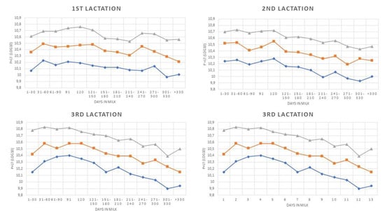 When P + LT were considered, a different scenario appears. Indeed, cows in first and second lactation have a significant lower amount of PMN and LYM, when compared to cows in third and higher lactation (Table 3). However, these differences are numerically not very large (7%), and they suggest that, in healthy animals, the number of immune cells is kept as constant as possible, as previously suggested [], and a reference value of 1.4 × 109 for P + LT in healthy cows can be proposed. Therefore, primiparous cows cannot be considered to have a different level of cell immunity compared to older cows, as suggested by the higher DSCC values observed. Indeed, the DSCC peak observed at the beginning of lactation in cows smoothen when P + LT is considered (Figure 1 and Figure 2). Very likely, the higher proportion of PMN and LYM are needed to compensate both the lower SCC levels and yield, generally observed in primiparous cows, in order to keep PMN and LYM at the proper level. These data also confirm that cows with very low SCC are not at greater risk of developing mastitis [], since there are not large differences in total milk PMN + LYM, when compared to older cows.