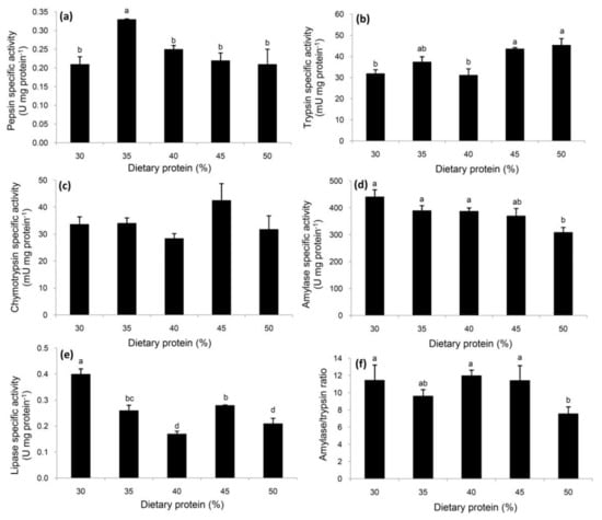 Specific activities of pepsin-like (a), trypsin (b), chymotrypsin (c), amylase (d), and lipase (e), and the ratio of amylase to trypsin (f) in E. singaporense crabs fed with various levels of dietary protein. Data are expressed as mean ± SEM (n = 5 per treatment). a,b,c,d Differences between means were tested with Duncan’s multiple range test, and are indicated by different superscripts (p < 0.05).