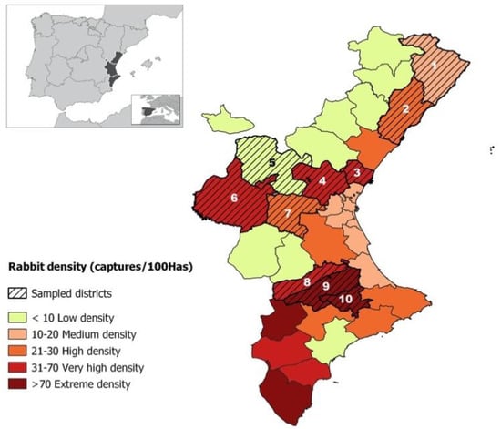 The regional Valencian districts were classified as: extreme density (>70 rabbits/100 Has/year), very high density (31–70 rabbits/100 Has/year), high density (21–30 rabbits/100 Has/year), medium density (10–20 rabbits/ 100 Has/year) and low density (<10 rabbits/100 Has/year). This classification was based on the last 5-year (2012–2017) declared annual captures (rabbits per 100 hectares) published by the Fish and Game Service of the Valencian Regional Government [] (Figure 1).
