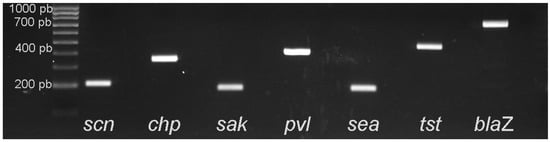 Samples were inoculated on blood-agar (Becton–Dickinson, Sparks, MD, USA) and incubated aerobically at 37 °C for 24–48 h. S. aureus strains were identified on the basis of morphological growth characteristics and hemolytic properties []. When contamination appeared with other bacteria, Mannitol Salt Agar (Becton–Dickinson, Sparks, MD, USA) was used to obtain isolated S. aureus colonies. Only the plaques with 10 or more S. aureus CFU were considered positive. Those colonies compatible with S. aureus were grown in TSB (Tryptic Soy Broth) at 37 °C for 12 h with shaking. To perform PCRs, genomic DNA was extracted from each isolate by a Genelute Bacterial Genomic DNA kit (Sigma-Aldrich, St. Louis, MO, USA) according to the manufacturer’s protocol, except for bacterial cells, which were lysed by lysostaphin (12.5 μg/mL, Sigma-Aldrich) at 37 °C for 1 h before DNA purification. Isolates were genotyped based on the analysis of the polymorphic regions of genes coa and spa as previously described []. Multilocus-sequence typing (MLST) was performed in the selected isolates []. According to sequence type (ST), isolates were ascribed to the different clonal complexes (CC). CC were assumed for some isolates according to their specific genotype [].