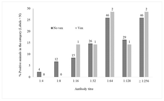 Distribution of CHV-1 antibody titres in the groups of nonvaccinated (No vax; n = 178) and vaccinated animals (Vax; n = 7). The percentage of animals showing the different antibody titres (1:4, 1:8, 1:16, 1:32, 1:64, 1:128, ≥1:126) appears on the y-axis, while the number in each category is written on the histogram.