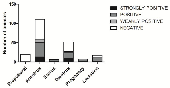 Distribution of serum titres among bitches in different reproductive conditions (Prepuberal, Pregnancy, Lactation) or cycle phases (Anestrus, Estrus, Diestrus). Different grey scales show different titre categories: 1:4–1:8 weakly positive; 1:64–1:128 positive; ≥1:256 strongly positive.