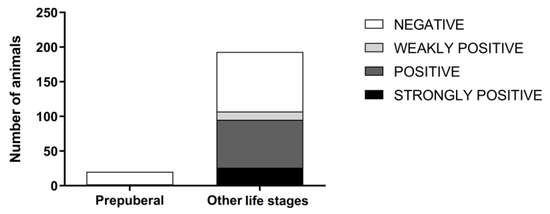 In the bitches, both seropositivity and the titre category were significantly associated with reproductive condition or cycle phase (p = 0.0022 and p = 0.0381 respectively) (Figure 2). Before puberty, the number of positive animals was significantly lower (p = 0.0001), and the titre category was significantly different from those in the post-puberal bitches (p = 0.0016) (Figure 3). When analysing both males and females, in accordance with the previous result from prepuberal females, age showed a significant effect on both seropositivity (p < 0.0001) and the serum titre (p < 0.0001).