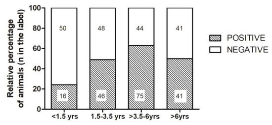 Relative percentage of seropositive (positive) and seronegative (negative) animals in the different age classes (<1.5 years; 1.5–3.5 years; >3.5–6 years; >6 years). The number of animals in each category appears in the histogram.