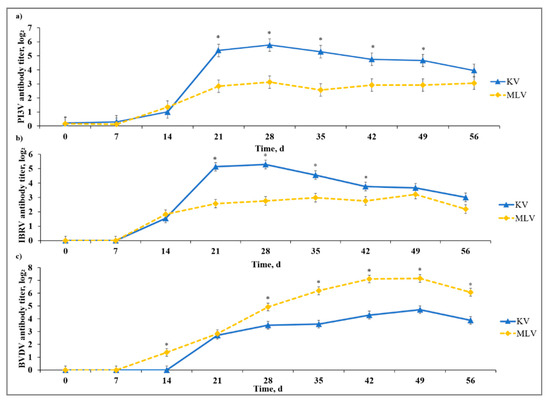 Effect of killed virus (KV; Triangle 5; Boehringer Ingelheim Animal Health, Inc. (BIAH)) and modified-live virus vaccination (MLV; Pyramid 5; BIAH) on serum antibody concentration against: (a) parainfluenza-3 virus (PI3V); (b) infectious bovine rhinotracheitits virus (IBRV); and (c) bovine viral diarrhea virus (BVDV) after subcutaneous injection of multivalent respiratory vaccine on Day 0 and KV booster on Day 14. Effect of vaccination on serum PI3V-specific antibody titer concentration (vaccine treatment × day effect; p < 0.01); serum IBRV-specific antibody titer concentration (vaccine treatment × day effect; p < 0.01); serum BVDV-specific antibody titer concentration (vaccine treatment × day effect; p < 0.01). * KV differs from MLV within day, p ≤ 0.02.