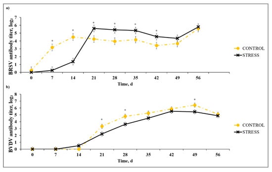 Effect of non-stress control (C; weaned on Day −37; transported to West Texas A&M University (WTAMU) research facility on Day −21; vaccination on Day 0) and stress model implementation (S: weaned on Day −3; transported to USDA-ARS Livestock Issues Research Unit on Day −2; relocated to WTAMU on Day −1; vaccination on Day 0) on serum antibody concentration against: (a) bovine respiratory syncytial virus (BRSV); and (b) bovine viral diarrhea virus (BVDV). Effect of non-stress control and stress model implementation on serum BRSV-specific antibody titer concentration (stress model × day effect; p < 0.01); serum BVDV-specific antibody titer concentration (stress model × day tendency; p < 0.09). * C differs from S within day, p ≤ 0.02.
