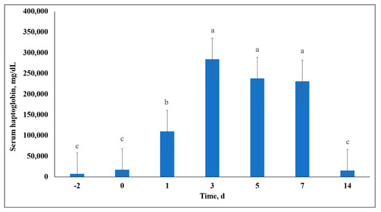Effect of day on serum haptoglobin (Hp) concentration. Serum Hp concentration (day effect; p < 0.01). Across day, unlike superscript letters indicate a difference (p ≤ 0.01) in means.
