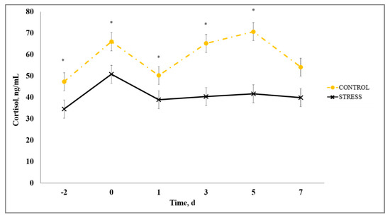 Effect of non-stress control (C; weaned on Day −37; transported to West Texas A&M University research facility on Day −21; vaccination on Day 0) and stress model implementation (S: weaned on Day −3; transported to USDA-ARS Livestock Issues Research Unit on Day −2; relocated to WTAMU on Day −1; vaccination on Day 0) on serum cortisol concentration. Serum cortisol concentration C vs. S (stress model × day interaction; p < 0.01). * C differs from S within day, p ≤ 0.05.