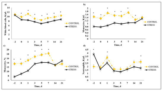 Effect of non-stress control (C; weaned on Day −37; transported to West Texas A&M University research facility on Day −21; vaccination on Day 0) and stress model implementation (S: weaned on Day −3; transported to USDA-ARS Livestock Issues Research Unit on Day −2; relocated to WTAMU on Day −1; vaccination on Day 0) on: (a) white blood cells (WBC); (b) monocytes (MONO); (c) percent monocytes (PERMONO); and (d) neutrophils (NEU). Effect of stress model implementation on WBC (stress model × day effect; p < 0.01); MONO (stress model × day effect; p < 0.01); PERMONO (stress model × day effect; p < 0.01); NEU (stress model × day effect; p < 0.01). * C differs from S within day, p ≤ 0.02.
