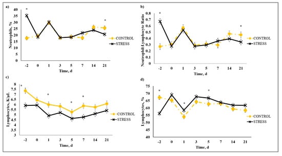 Effect of stress-model control (C; weaned on Day −37; transported to West Texas A&M University research facility on Day −21; vaccination on Day 0) and stress model implementation (S: weaned on Day −3; transported to USDA-ARS Livestock Issues Research Unit on Day −2; relocated to WTAMU on Day −1; vaccination on Day 0) on: (a) percent neutrophils (PERNEU); (b) neutrophil:lymphocyte ratio (N:L); (c) lymphocytes (LYM); and (d) percent lymphocytes (PERLYM). Effect of stress model implementation on PERNEU (stress model × day effect; p < 0.01); N:L (stress model × day effect; p < 0.01); LYM (stress model × day effect; p < 0.01); PERLYM (stress model × day effect; p < 0.01). * C differs from S within day, p ≤ 0.02.
