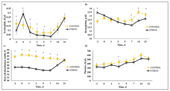 Effect of non-stress control (C; weaned on Day −37; transported to West Texas A&M University research facility on Day −21; vaccination on Day 0) and stress model implementation (S: weaned on Day −3; transported to USDA-ARS Livestock Issues Research Unit on Day −2; relocated to WTAMU on Day −1; vaccination on Day 0) on: (a) eosinophils (EOS); (b) hemoglobin (HGB); (c) red cell distribution width (RDW); and (d) platelets (PLT). Effect of stress model implementation on EOS (stress model × day effect; p < 0.01); HGB (stress model × day effect; p < 0.01); RDW (stress model × day effect; p < 0.01); PLT (stress model × day effect; p < 0.02). * C differs from S within day, p ≤ 0.05.
