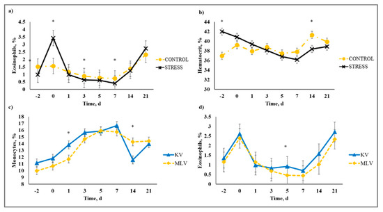 Effect of non-stress control (C; weaned on Day −37; transported to West Texas A&M University research facility on Day −21; vaccination on Day 0) and stress model implementation (S: weaned on Day −3; transported to USDA-ARS Livestock Issues Research Unit on Day −2; relocated to WTAMU on Day −1; vaccination on Day 0) on: (a) percent eosinophils (PEREOS); and (b) hematocrit (HCT). Effect of stress model on PEREOS (stress model × day effect; p < 0.01); HCT (stress model × day effect; p < 0.01) and effect of killed virus (KV; Triangle 5; Boehringer Ingelheim Animal Health, Inc. (BIAH)) and modified-live virus vaccination (MLV; Pyramid 5; BIAH) treatment on: (c) percent monocytes (PERMONO); and (d) percent eosinophils (PEREOS) after subcutaneous injection of multivalent respiratory vaccine on day 0. Effect of vaccination on PERMONO (vaccine treatment × day effect; p < 0.01); PEREOS (vaccine treatment × day effect; p < 0.01). * C differs from S within day, p ≤ 0.02; * KV differs from MLV within day, p ≤ 0.02.
