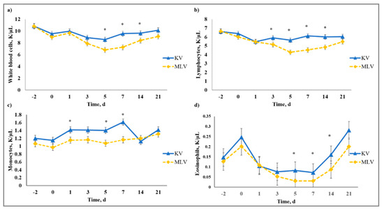 Effect of killed virus (KV; Triangle 5; Boehringer Ingelheim Animal Health, Inc. (BIAH)) and modified-live virus vaccination (MLV; Pyramid 5; BIAH) on: (a) white blood cells (WBC); (b) lymphocytes (LYM); (c) monocytes (MONO); and (d) eosinophils (EOS) after subcutaneous injection of multivalent respiratory vaccine on Day 0. Effect of vaccination on WBC (vaccine treatment × day effect; p < 0.01); LYM (vaccine treatment × day effect; p < 0.01); MONO (vaccine treatment × day effect; p < 0.01); EOS (vaccine treatment × day effect; p < 0.01). * KV differs from MLV within day, p ≤ 0.04.