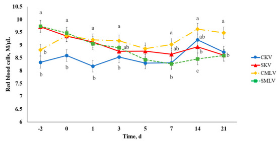 A stress model × vaccine type × day interaction existed (p < 0.04) for RBC (Figure 10). A difference was observed between CKV and CMLV calves such that CMLV had greater (p ≤ 0.05) RBC on Days 0–7 and 21. Additionally, SMLV and SKV calves had increased (p ≤ 0.05) RBC compared to CKV calves on Days −2, 0, and 1. These results could indicate more dehydration among treatments with elevated RBC because, as previously mentioned, RBC are known to increase during water deprivation in cattle [35,38]. In addition, decreased WBC due to leukocyte migration would additively cause an increase in RBC. The increases in RBC for SMLV and SKV were likely a result of our stress model implementation with disrupted water intake immediately prior to vaccination because calves were transported from the origin ranch to USDA-ARS on Day −2 and to WTAMU on Day −1.