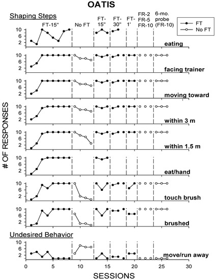 By the third session of the FT-15 s schedule, Oatis ate 100% of the trial-starting food thrown at him and completed 90–100% of the steps and target response of being brushed. Within a few sessions of the FT-15 s schedule, Oatis would bypass some of the initial trial-starting food to be simultaneously brushed and fed every 15 s under this schedule. The removal of the FT-15 s schedule rapidly diminished the completion of most steps in the shaping procedure and increased the moving away to occur more frequently than during the FT-15 s schedule, presumably because no trial-starting food was thrown. The reintroduction of the FT-15 s and later FT-30 s, FT-1 min, and FR schedules successfully maintained completion of the target response during the rest of the experiment, and the 6-month probe demonstrated a 100% retention of the target response.