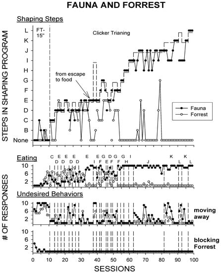 During the initial 10 sessions of the experiment, when the FT-15 s baseline condition was imposed, both Fauna and Forrest exhibited few of the criteria later selected for intervention, few eating responses (10% and 20% of all trials for Fauna and Forrest, respectively), and displayed a high frequency of moving away from the trainer. In addition, the “blocking Forrest” response was only observed during the baseline condition, occurring several times in the first few sessions, but decreasing to 0 for the last three sessions.