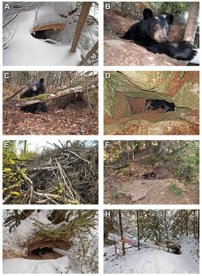 - Tietje, W.D.; Ruff, R.L. Denning behavior of black bears in boreal forest of Alberta. J. Wildl. Manag. 1980, 44, 858–870. [Google Scholar] [CrossRef]
