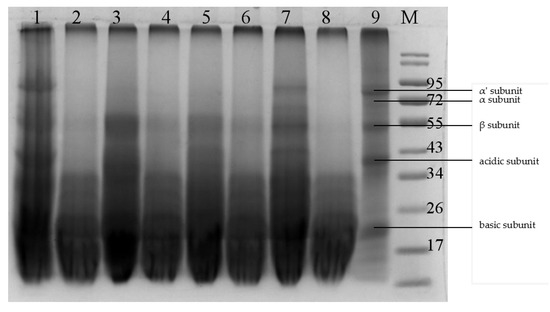 - Maruyama, N.; Sato, R.; Wada, Y.; Matsumura, Y.; Goto, H.; Okuda, E.; Nakagawa, S.; Utsumi, S. Structure-physicochemical function relationships of soybean β-conglycinin constituent subunits. J. Agric. Food Chem. 1999, 47, 5278–5284. [Google Scholar] [CrossRef]