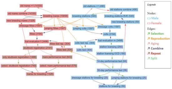 Figure 1. As an initial step, fillies and colts were assessed in a foal show. For mares, the studbook registration and subsequent mare performance tests for about one third of the animals was simulated. For the stallions, the selection steps were represented by simulating stallion licensing, the 14-day performance test and the 50-day performance test. For the latter it was assumed that half of the breeding stallions were selected according to dressage traits and the other half according to jumping traits. In addition, a one-year breeding assignment after the successful assessment test was simulated before the 50-day performance test. It was assumed that the combination of the 14-day performance test and the 50-day performance test can be regarded as equivalent to all ten other possible paths to final breeding approval for German Warmblood stallions [