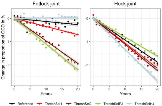 A threshold selection, discarding horses with OCD in fetlock or hock joints (ThreshSel2) showed a substantial decrease in the occurrence of OCD of about −2.0% in the fetlock joint and about −2.2% in the hock joint within 20 years. In the threshold selection, only stallions showing OCD in both joints were excluded from breeding (ThreshSel1), the result for the decrease in OCD occurrence in the hock joint was the same as in the previous scenario (ThreshSel2), but the decrease in the fetlock joint was much lower (0.9% within 20 years). Selecting only against OCD in fetlock joint (ThreshSelFJ) led to a comparable reduction of OCD frequency for this joint (−2.1%) as in the ThreshSel2 scenario, but for the hock joint the reduction of OCD was less than in the Reference (−1.5%). When selecting only against OCD in the hock joint (ThreshSelHJ), the highest reduction of OCD in the hock joint (−2.7%) among the threshold selection scenarios was observed, but led to an increase of OCD in the fetlock joint (+0.2%;